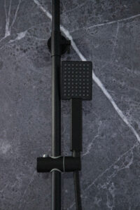 Para una mayor ergonomía, el conjunto integra un soporte deslizante que permite ajustar la altura de la ducha de mano según las necesidades de cada usuario, adaptándose a distintos perfiles y usos. Además, la columna está diseñada para ofrecer un flujo de agua equilibrado y eficiente, optimizando el consumo sin comprometer el confort durante la ducha.